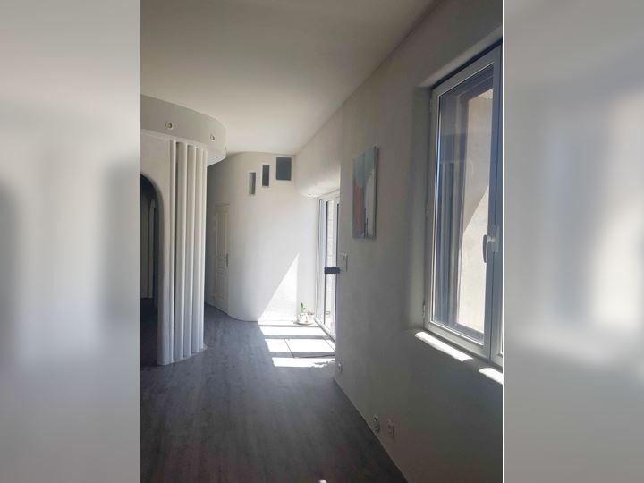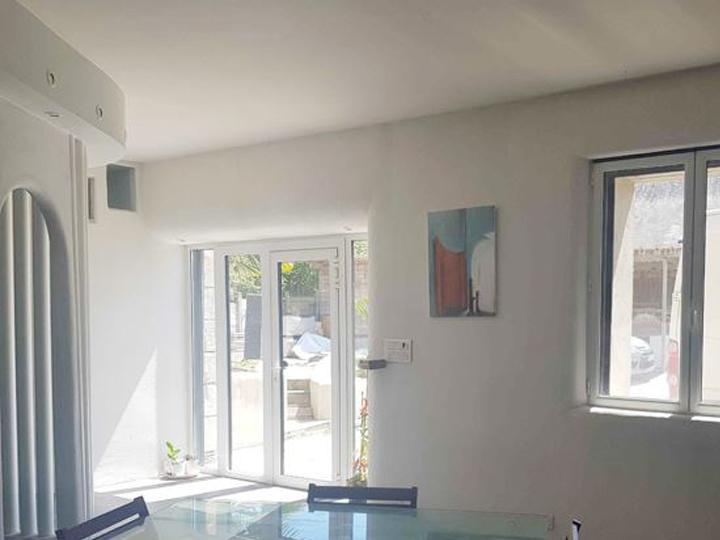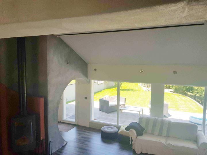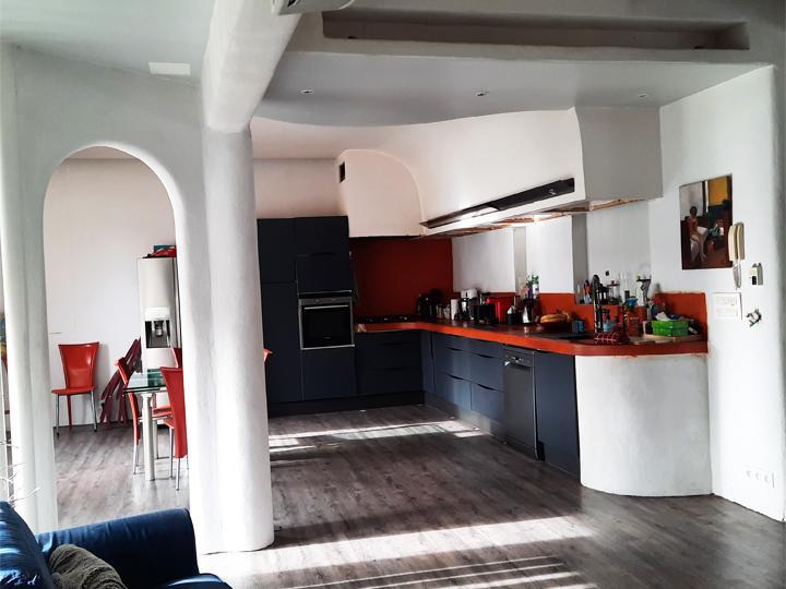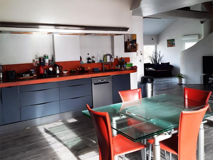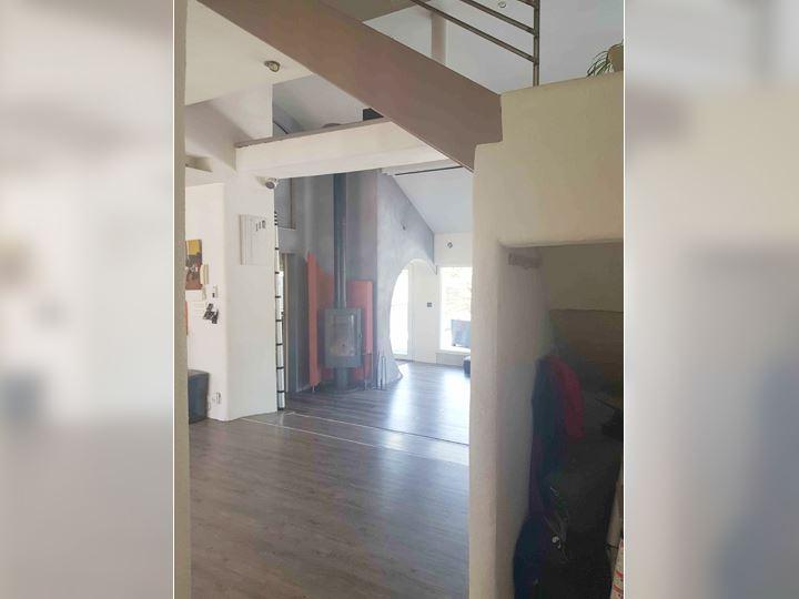 Vaste pièce à vivre (salle de séjour + salon avec poêle à bois) avec accès à la terrasse et au jardin + cuisine ouverte, aménagée et équipée (Hauteur sous plafond : 2,90 m) |